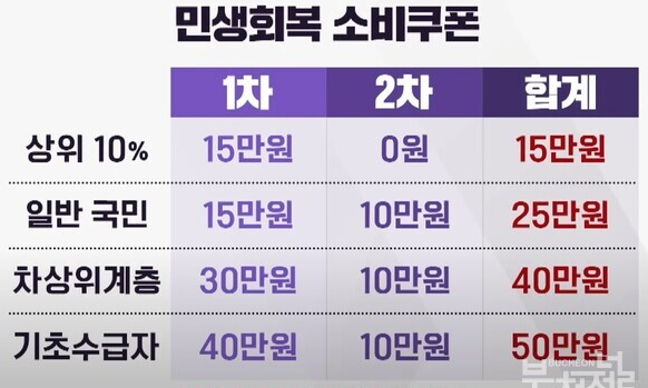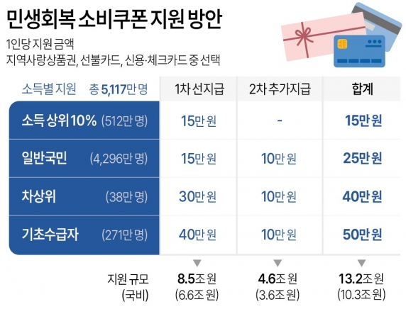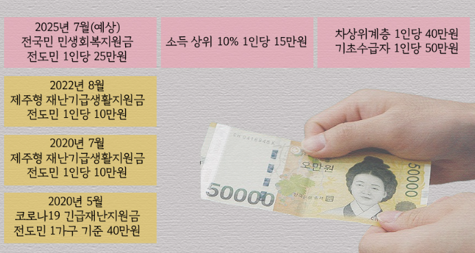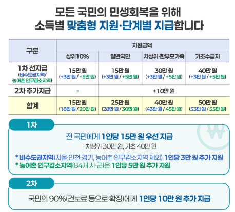 - 기본 지급: 모든 국민 15만 원 (소득 상위 10% 제외).